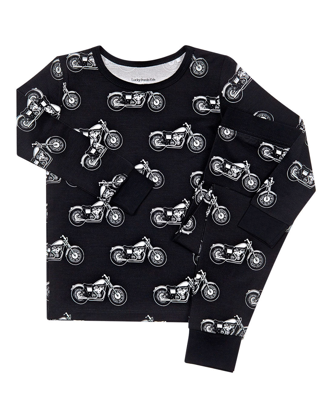 Gear up for endless fun with the Bamboo Two Piece Set | Born to Ride Black. Featuring all over motorcycle prints, this set adds a dose of adventure to everyday wear. Made from stretchy, breathable bamboo fabric, it moves with your little one for all day comfort whether they are racing through playtime or winding down for bedtime.