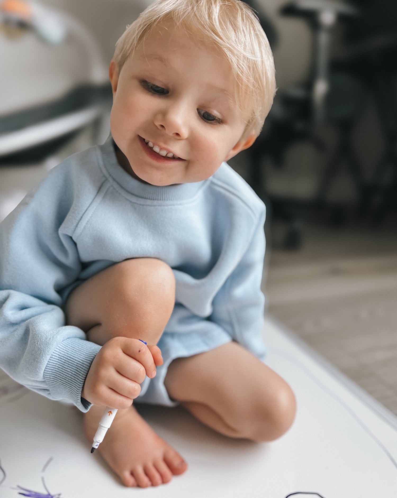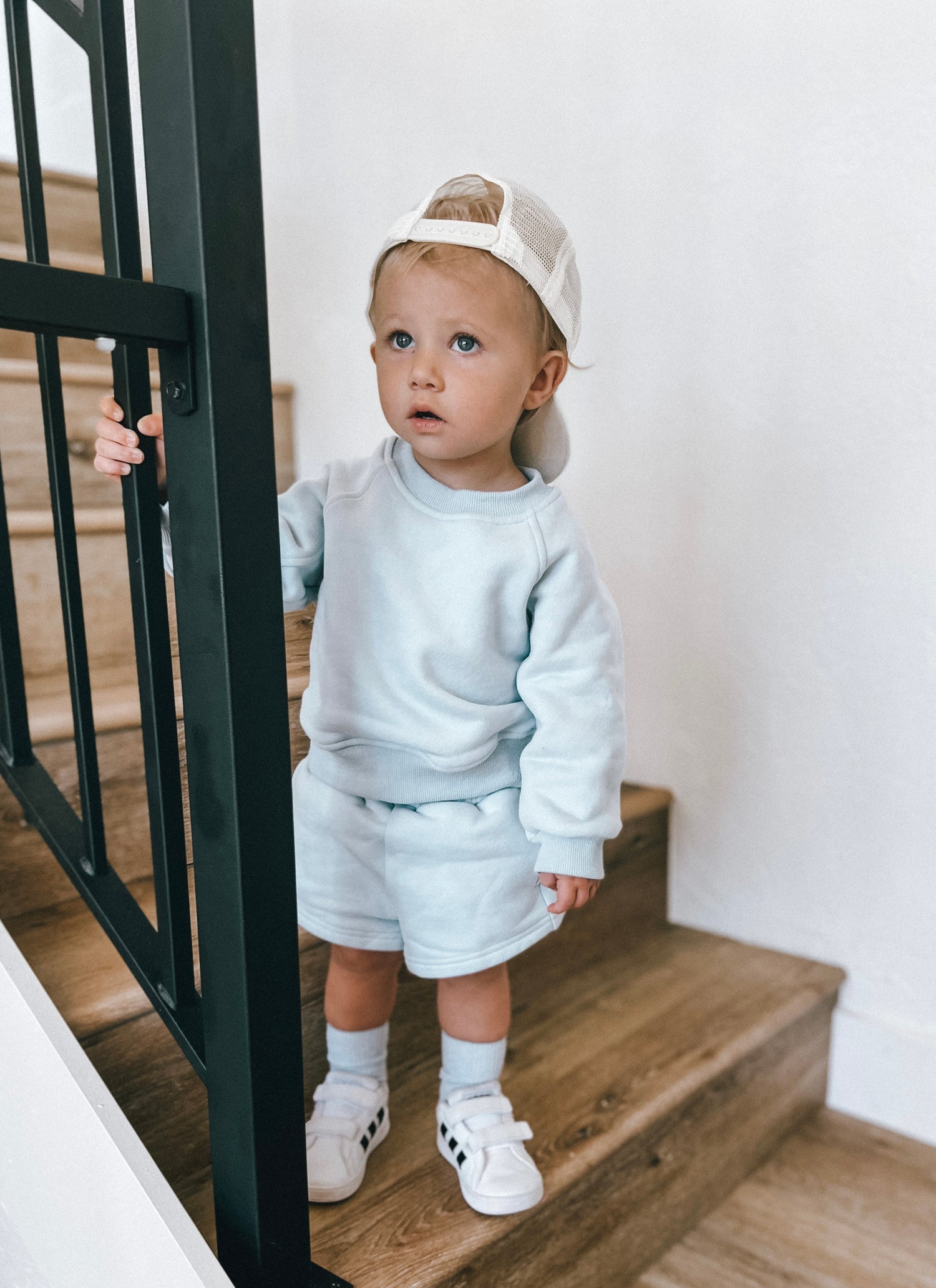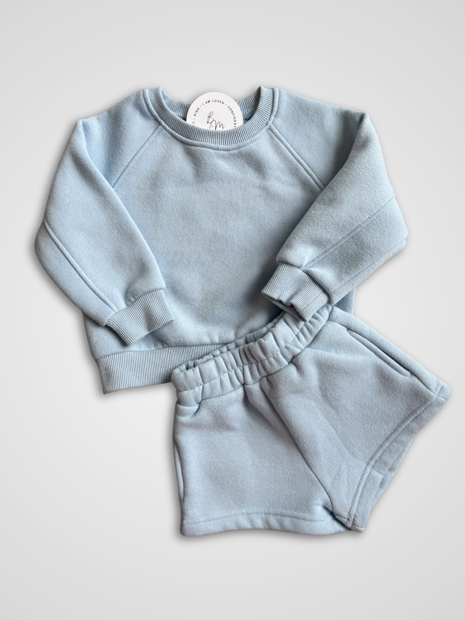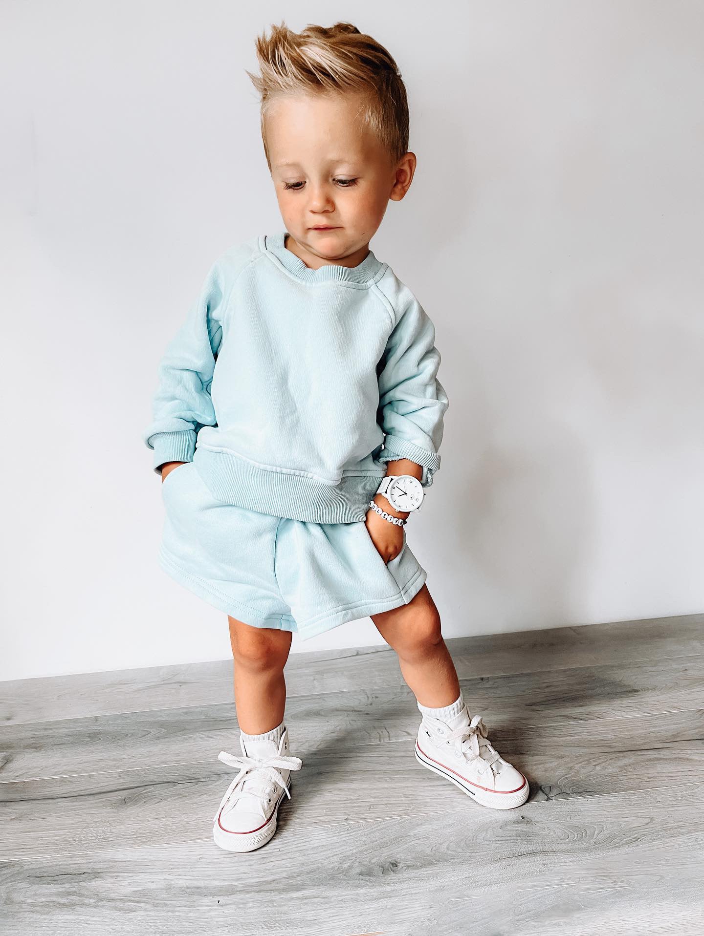 Introducing our BEST SELLING Bubba Blue sweat set - the ultimate cozy combo for any weather! Made of 100% French Terry cotton, this sweatshirt and shorts set (complete with pockets) is a must-have for sizes 0-5T. Whether it's a rainy day or a summer night, you'll be snug as a bug in this soft and comfortable set. The smaller sizes slightly differ in color from the bigger sizes.