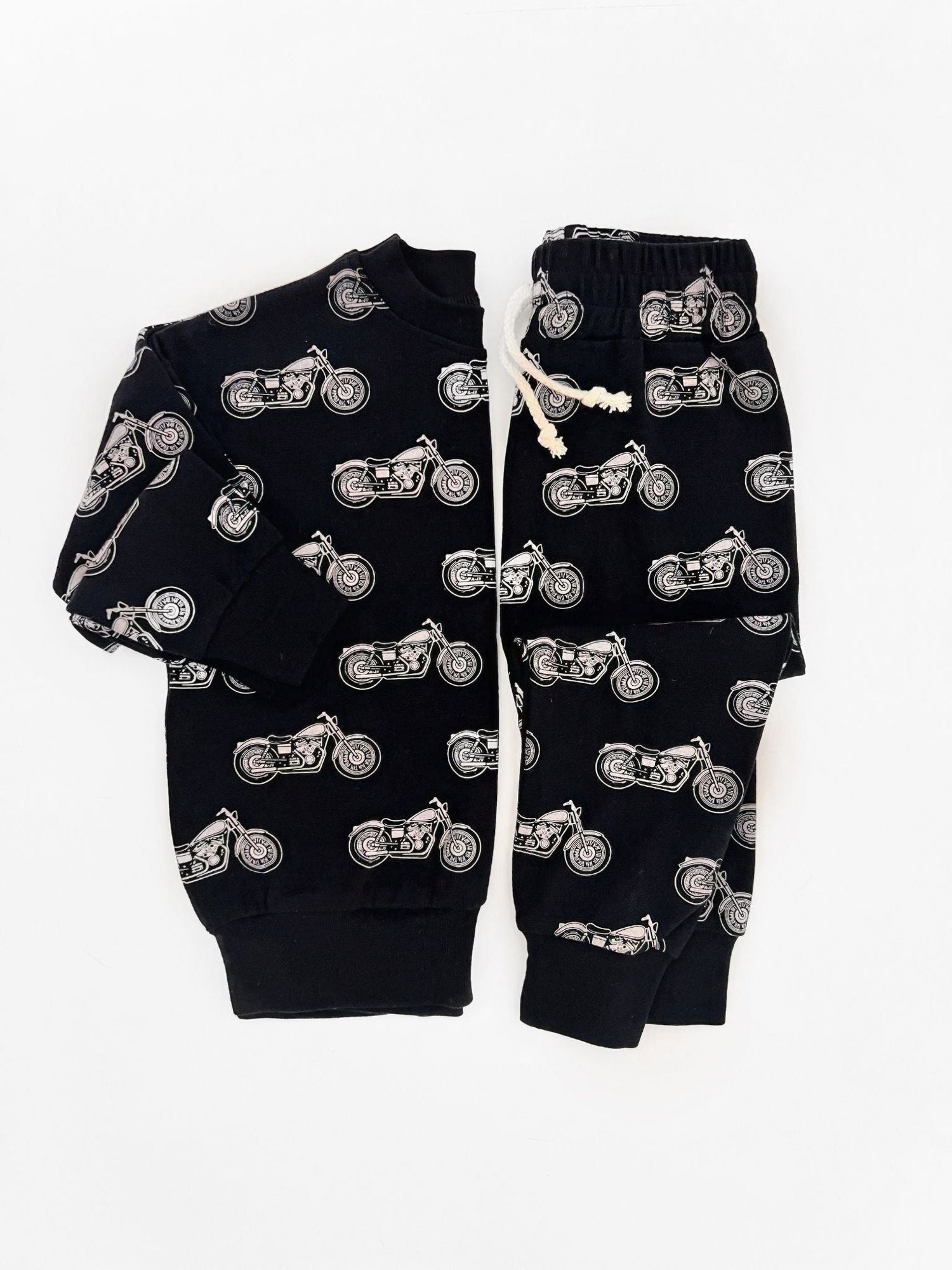 The Born to Ride Black | Jogger Set is crafted from soft cotton for all-day comfort and easy wear. With its relaxed fit and striking black and white motorcycle design, this set blends playful energy with effortless style. Perfect for active days, it is a versatile favorite for every little rider.